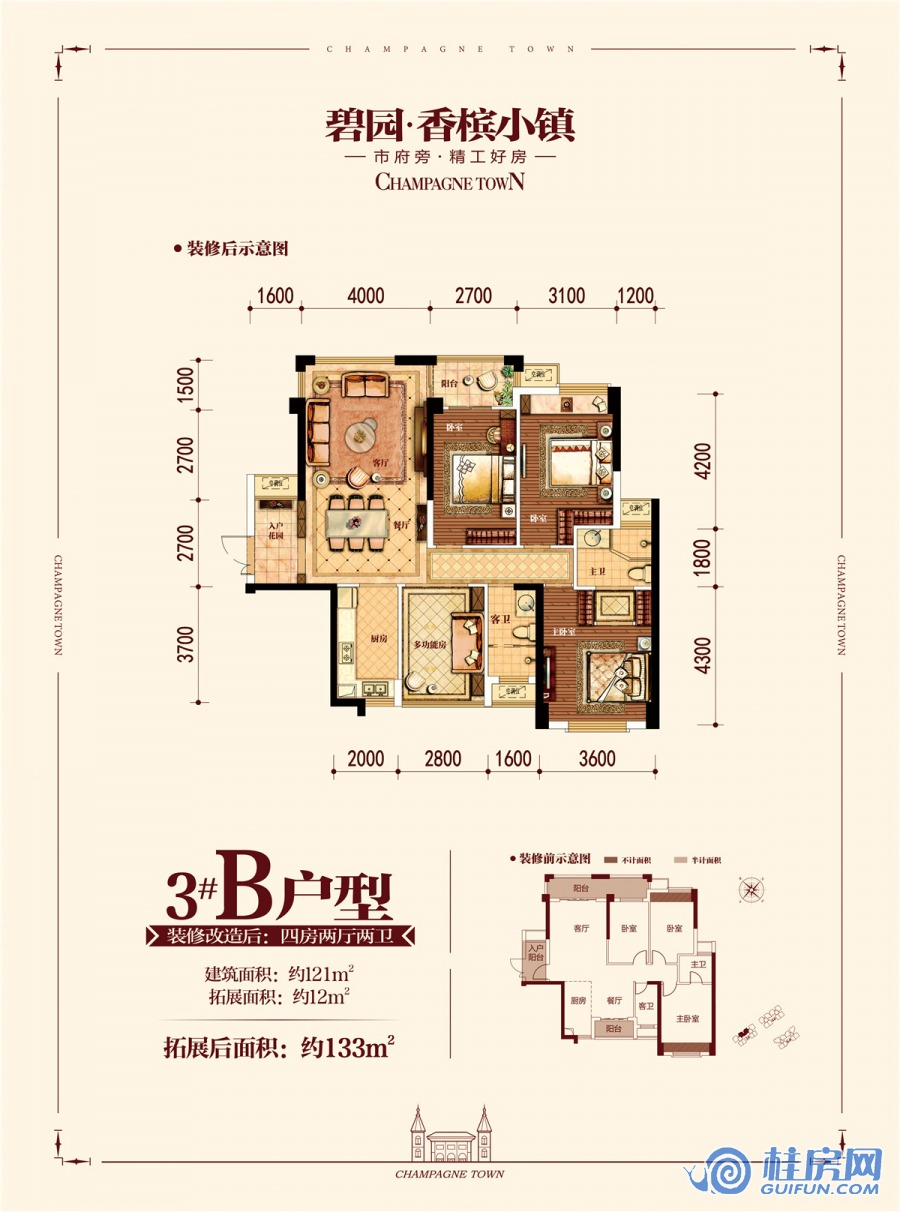 了解碧园香槟小镇3#B户型 约121㎡ 四房两厅两卫户型的详细信息