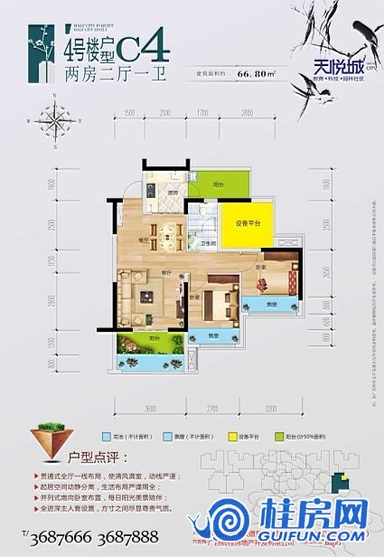 了解桂林电子商城天悦城 4#楼C4户型 两房两厅一卫 建面66.80㎡户型的详细信息