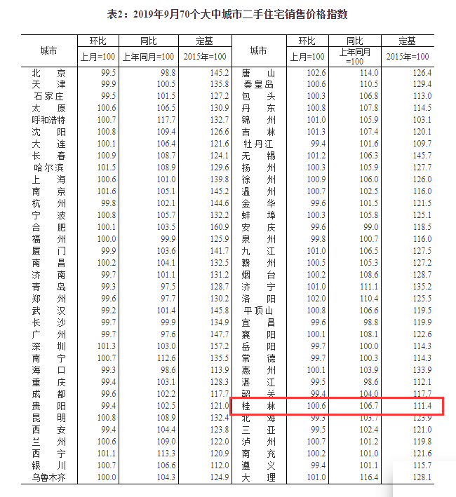 据统计数据显示,9月份桂林新建商品住宅价格,环比上涨1.0%,同比上涨10.3%;二手房环比上涨0.6%,同比上涨6.7%。