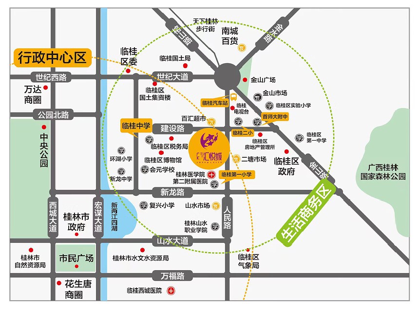 广汇•汇悦城位于临桂区人民路与建设路交汇处(临桂二小对面),10栋高层、公寓、商业等2000多住户的规模形成了城央26万方醇熟生活城.。尽享医疗,教育,购物等一站式繁华配套,是临桂唯一一个自带广场的小区。