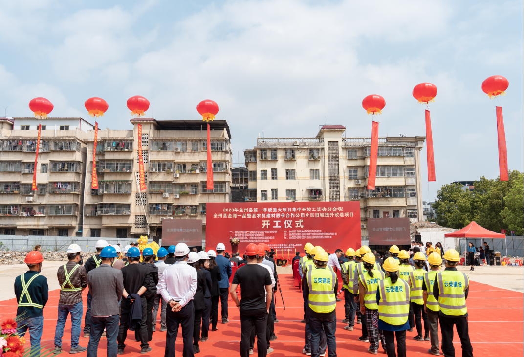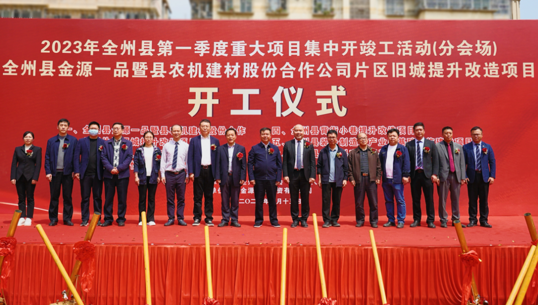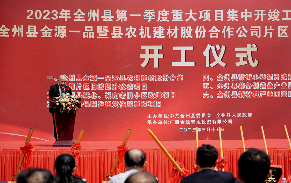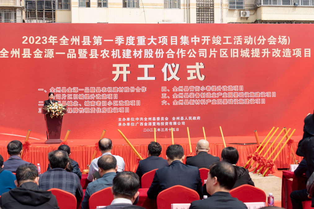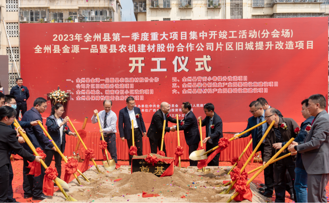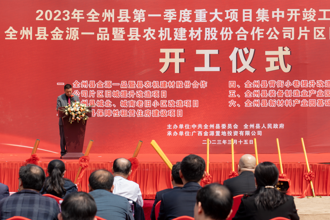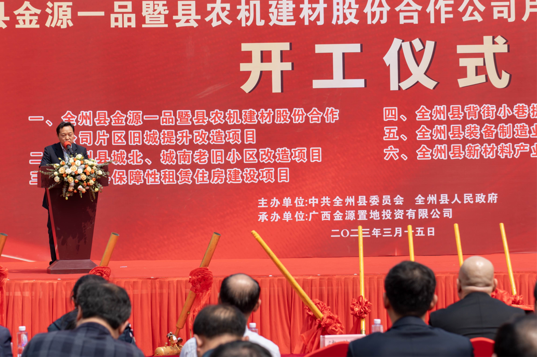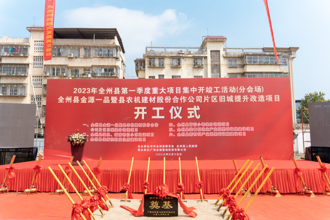 2023年3月15日上午,全州县2023年第一季度重大项目集中开竣工活动、全州金源一品暨县农机建材股份合作公司片区旧城提升改造项目开工仪式在全州县桂黄北路“金源一品”项目所在地举行,金源集团在桂林首个项目正式扬土奠基!