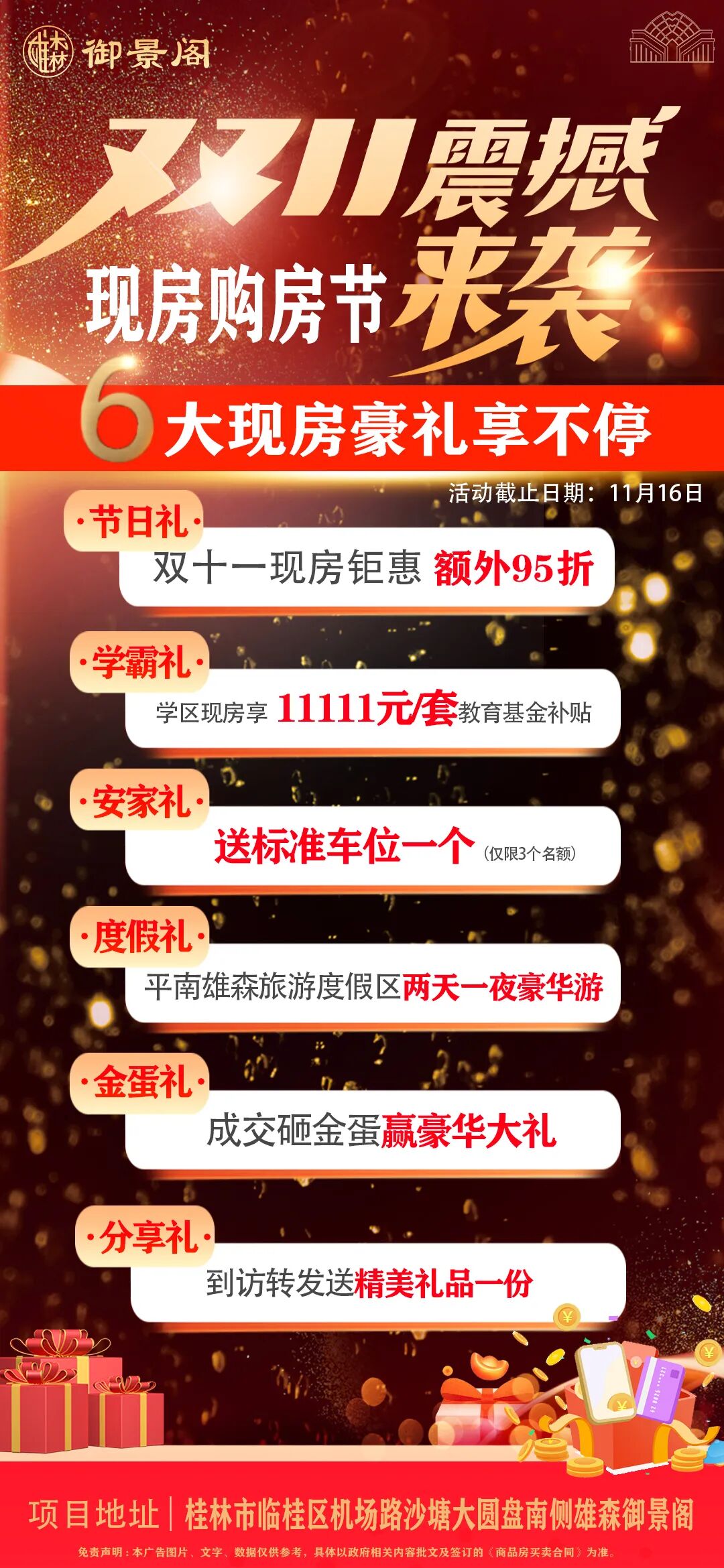目前,桂林不少热门楼盘的 “双十一” 购房特惠已陆续上线,大居也为大家整理好了热门楼盘的促销政策。不妨趁着这个优惠窗口期,奔赴楼盘现场实地探访,既能挑选心仪好房,还能参与现场趣味活动,说不定就能以心动价格拿下理想家!