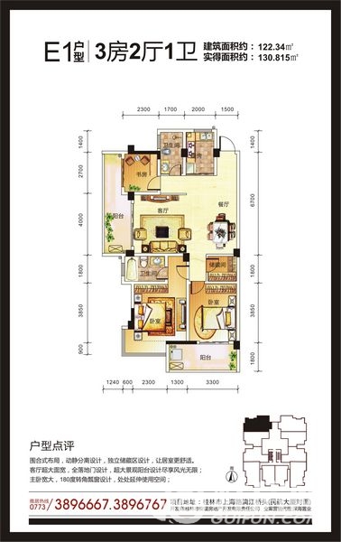 了解安厦?港湾雅居 E1户型 三房两厅一卫 122.34㎡户型的详细信息
