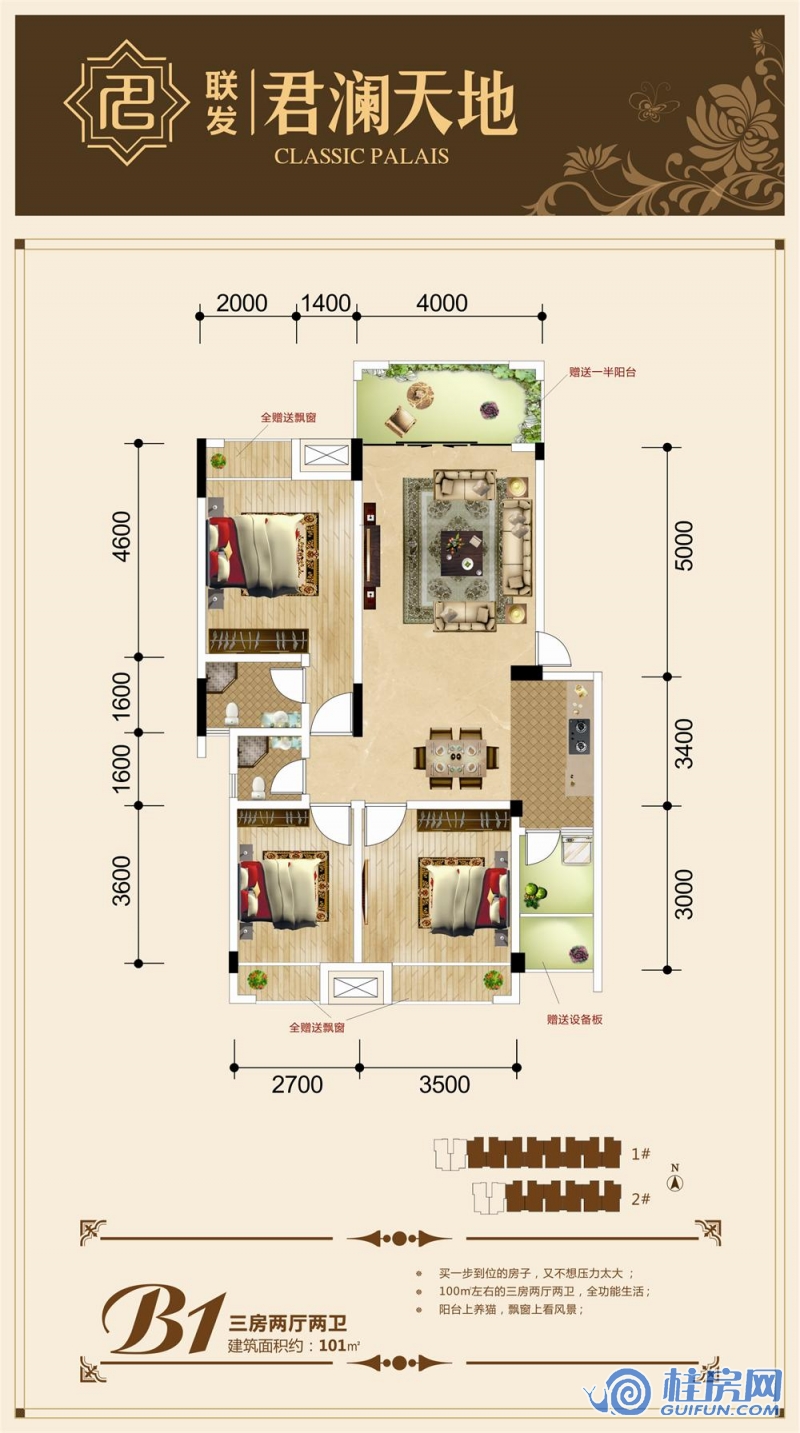 了解联发君澜天地1#、2#B1三房两厅两卫 建筑面积101㎡户型的详细信息