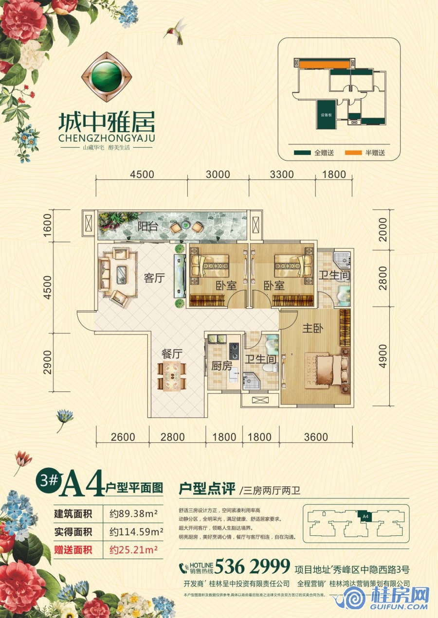3室2厅2卫城中雅居3#A4户型 三房两厅两卫 建面约89.38㎡