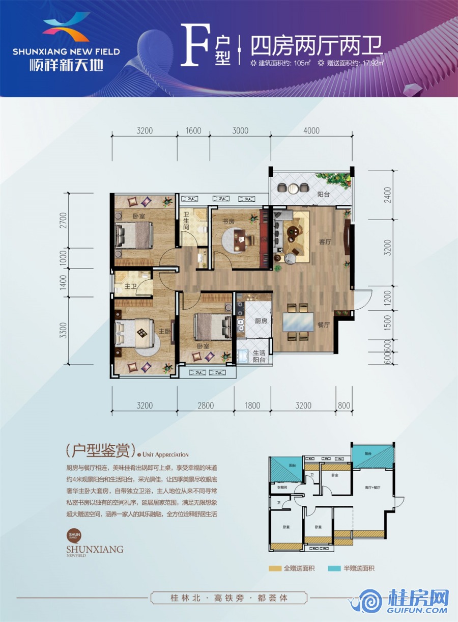 了解顺祥新天地F户型 四房两厅两卫 约105㎡户型的详细信息