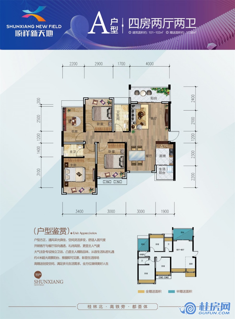 了解顺祥新天地A户型 四房两厅两卫 约101-103㎡户型的详细信息