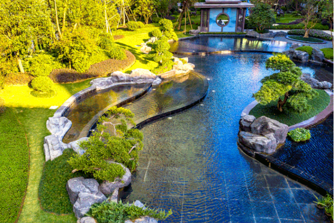 项目园林的造景,师法自然,取镜东方,虽然园林设计风格为新中式,但却不是古代园林的复刻,而是一种更加接近自然,更加亲近居住者的创意。