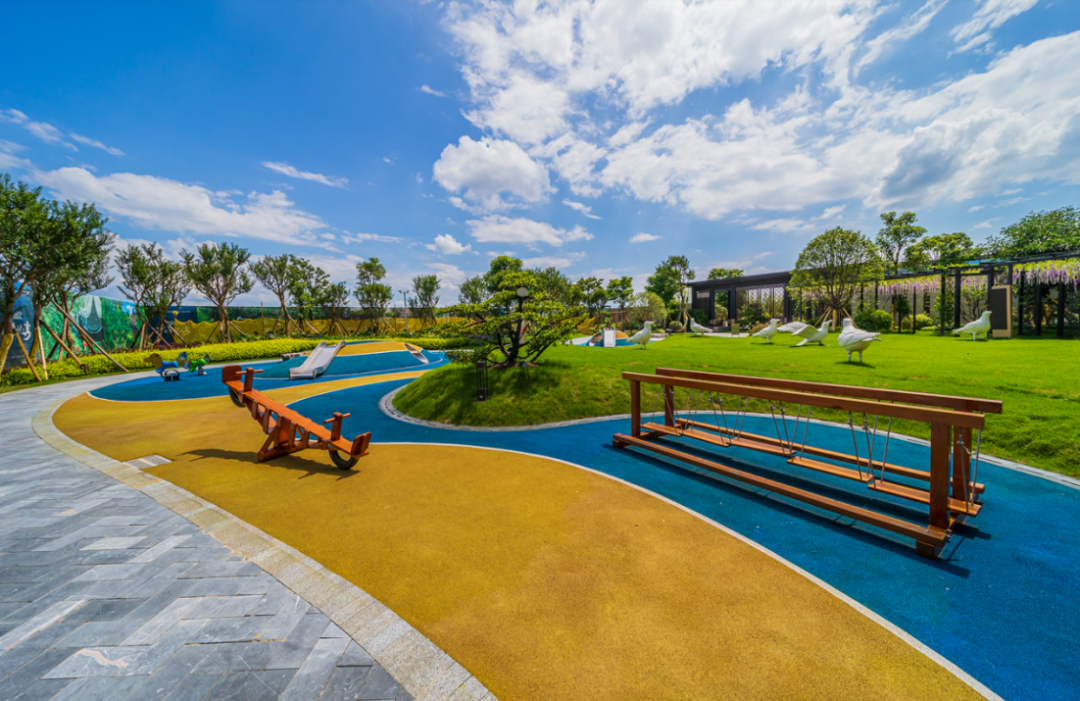 苑区内设置有许多温馨提示标语,如小心地滑、小心台阶、爱护花草等;健身娱乐器材都为圆角设置,减少儿童娱乐时发生意外。