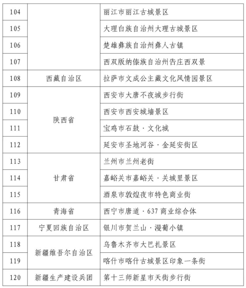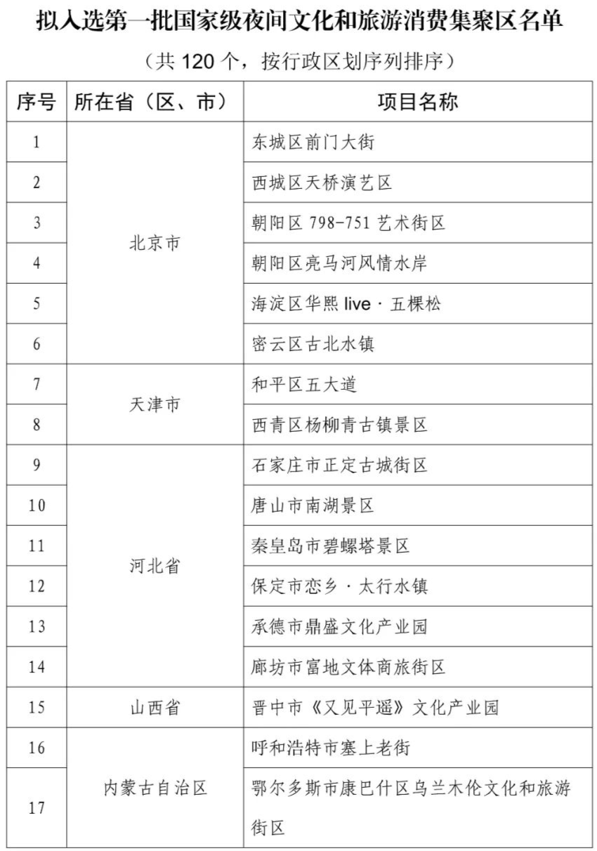 根据《文化和旅游部办公厅关于开展第一批国家级夜间文化和旅游消费集聚区建设工作的通知》(办产业发〔2021〕123号),经地方申报、省厅推荐、合规性审查、专家评审、舆情风控、实地考察等方式,拟确定北京市东城区前门大街等120个项目为第一批国家级夜间文化和旅游消费集聚区,名单公示附后。