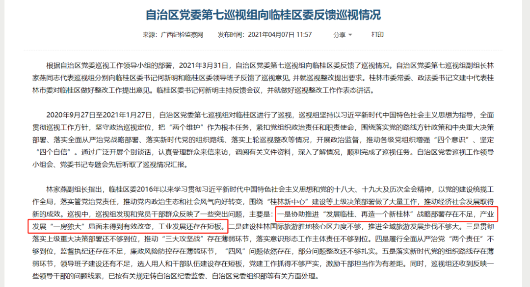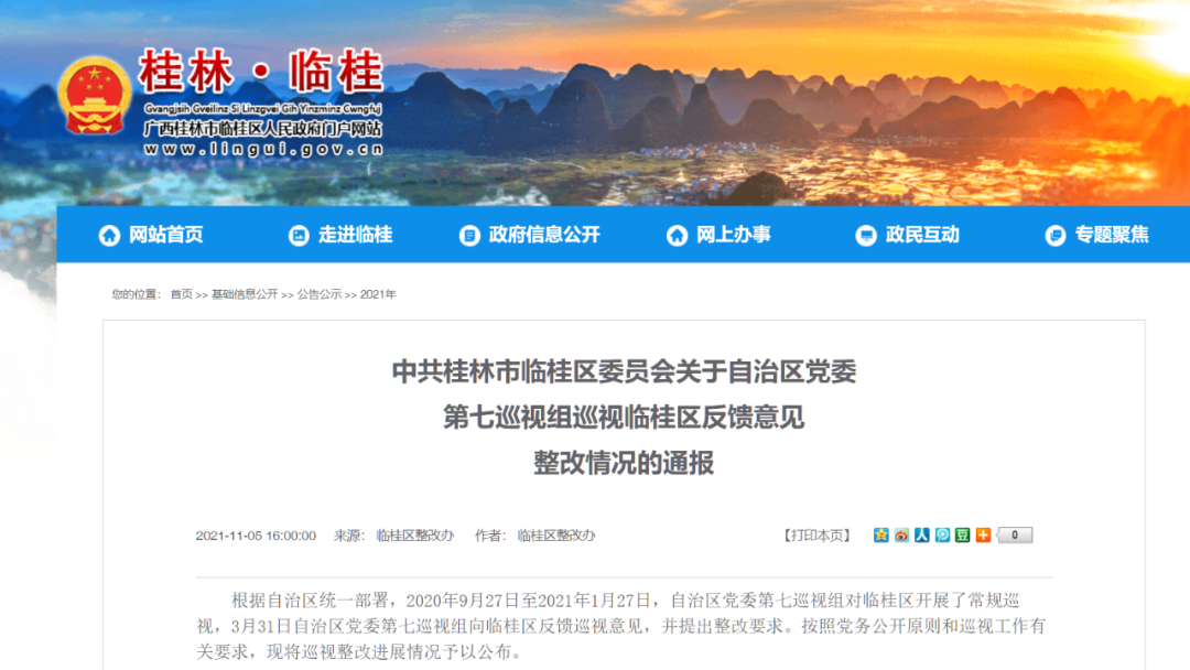 11月5日,临桂区政府网站发布了《中共桂林市临桂区委员会关于自治区党委第七巡视组巡视临桂区反馈意见整改情况的通报》。