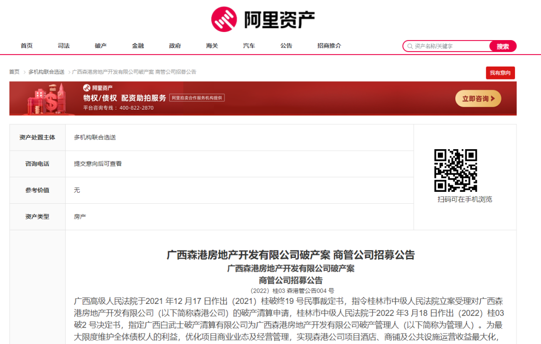 到2021年12月17日,广西高级人民法院作出(2021)桂破终19号民事裁定书,指令桂林市中级人民法院立案受理申请人深圳市宇航机电工程有限公司对被申请人广西森港房地产开发有限公司(以下简称“森港公司”)的破产清算申请。在今年3月份,桂林市中级人民法院于指定广西白武士破产清算有限公司为桂林森港公司破产管理人(以下简称为“管理人”)。4月,管理人也对外发布了《广西森港房地产开发有限公司破产案重整投资人招募公告》。