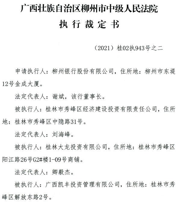 户名广西壮族自治区柳州市中级人民法院对被执行人桂林市秀峰区经济建设投资有限责任公司名下位于桂林市秀峰区翠竹路68号莲花塘社区安置点A25#-1地块商住楼1-5层房产进行公开拍卖,起拍价4.8395亿元。