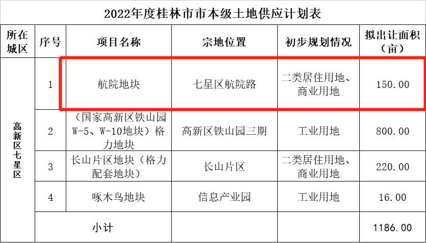 于居住用地和商业用地来说,今年主城区有不少是桂林本级土地供应计划中的。此次上市的GJ202206地块,从宗地位置及面积等来看,即是七星区今年计划供应的“航院地块”,宗地位于七星区航院路,出让面积150亩。