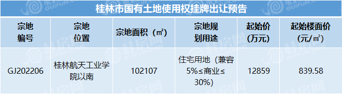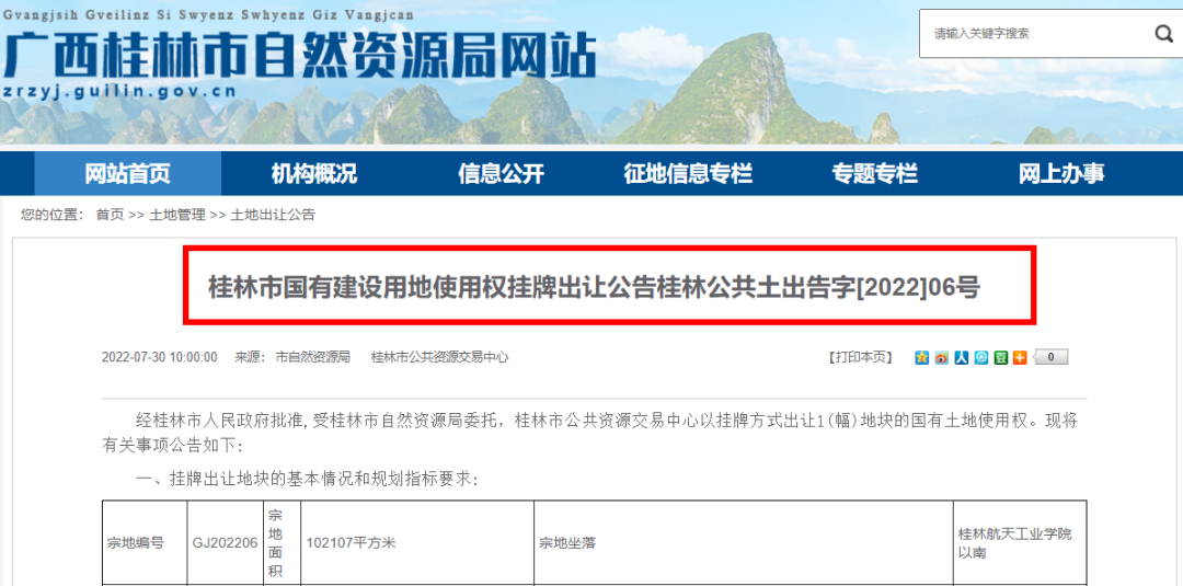 7月30日,桂林市自然资源局发布公告显示,将以挂牌方式出让 1(幅) 地块的国有土地使用权。根据桂林公共土出告字[2022]06号,该地块宗地编号为GJ202206,该宗地按规划编号为QX.HYN-4-1。宗地位于桂林航天工业学院以南,规划为住宅用地(兼容5%≤商业≤30%)。
