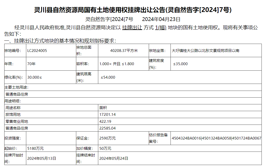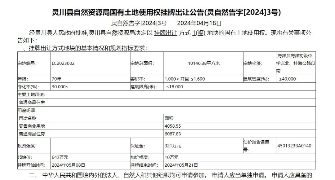 据小桂统计,4月18日至23日一周时间内,灵川县挂出4宗涉宅用地、1宗零售商业用地、1宗工业用地,起始总价超2个亿。