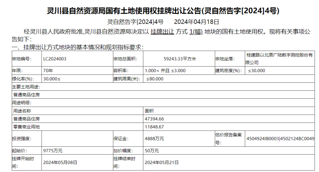 LC2024003地块位于桂建路以北原广陆数字测控股份有限公司,土地面积59243.33平方米(折合约88.86亩),包含普通商品住房用地47394.66平方米,零售商业用地11848.67平方米。
