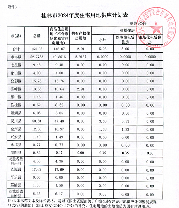 日前,桂林市本级2024年度国有建设用地供应计划出炉,全年计划供应202.50公顷。其中,商服用地67.20公顷,商品住房用地52.78公顷,保障性安居工程用地0公顷,公共管理与商服用地21.69公顷。