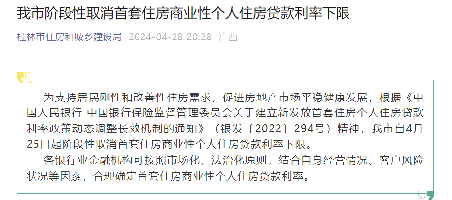 2024年4月28日晚间,桂林市住建局官方公众号发布消息,宣布阶段性取消桂林市首套住房商业性个人住房贷款利率下限,新政自4月25日起执行。