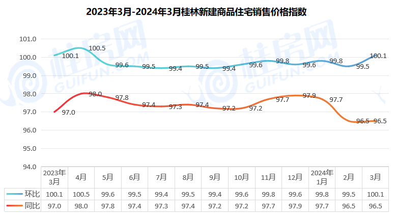 自去年5月以来,桂林新建商品房价格指数环比、同比已连续10个月保持下跌态势,仅在2024年3月环比出现0.1%微幅上涨;同比降幅仍达到3.5%。