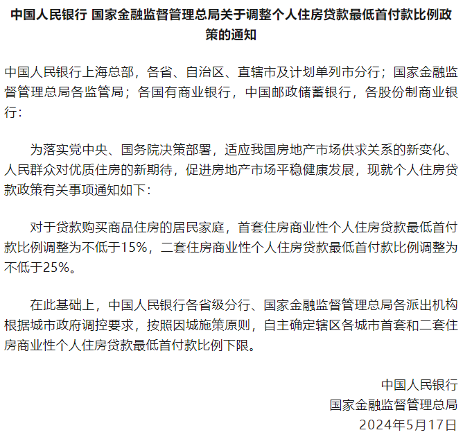 通知还指出,在此基础上,中国人民银行各省级分行、国家金融监督管理总局各派出机构,根据城市政府调控要求,按照因城施策原则,自主确定辖区各城市首套和二套住房商业性个人住房贷款最低首付款比例下限。