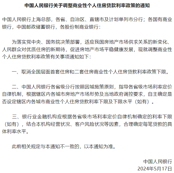 首先来看央行关于利率下限的通知,根据《中国人民银行关于调整商业性个人住房贷款利率政策的通知》,将对以下三个方面进行调整:
