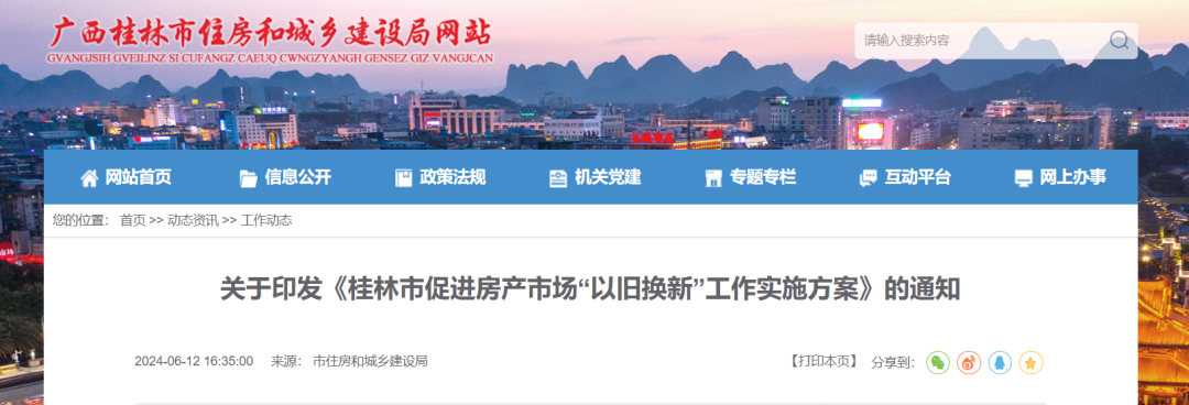 今天(6月12日)下午16点35分,桂林市住建局官网发布《桂林市促进房产市场“以旧换新”工作实施方案》的通知,正式官宣住房“以旧换新”。