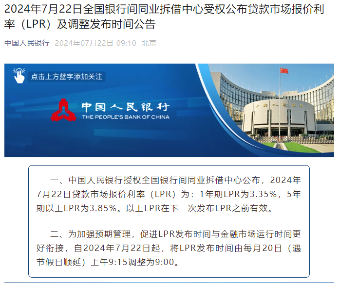 中国人民银行授权全国银行间同业拆借中心公布,2024年7月22日贷款市场报价利率(LPR)为:1年期LPR为3.35%,5年期以上LPR为3.85%。