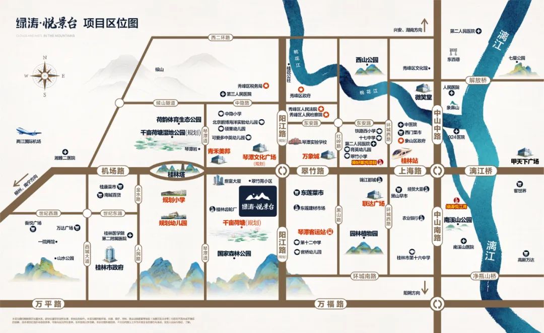 项目距离桂林万象城仅约500米,周边环绕着多个成熟居住小区和重要的政务单位,2公里范围内均为规划旧改资源区和配套升级区域,规划有桂林第一梯队的公办教育资源——中华小学和解西幼儿园,以及千亩荷塘湿地公园等城市配套,未来发展潜力无限。