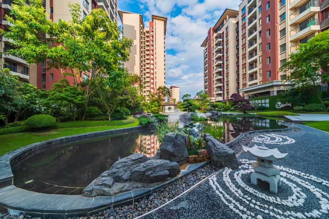 园林,是绿涛·悦景台的一大亮点。设计灵感源自南宋山水画《碧山仙境图》,巧妙借鉴桂林山水之灵韵,通过“一轴、一环、六院、八景”的匠心布局,将江泉、轻舟、青山、屿林等自然元素融入现代园林设计之中,打造出秀峰区首屈一指的宋式庭院景观,让古典雅韵与现代审美在此和谐共生。