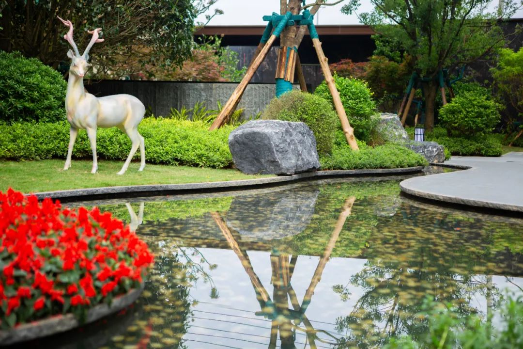虽是新交房,但园林内并没有裸露的黄土或缺乏时间生长的花木,反而草木丰茂、花丛灌木交错迷叠,大片的红枫和全冠移植而来的乔木,交付了一年以上的小区也未必能达到这样。
