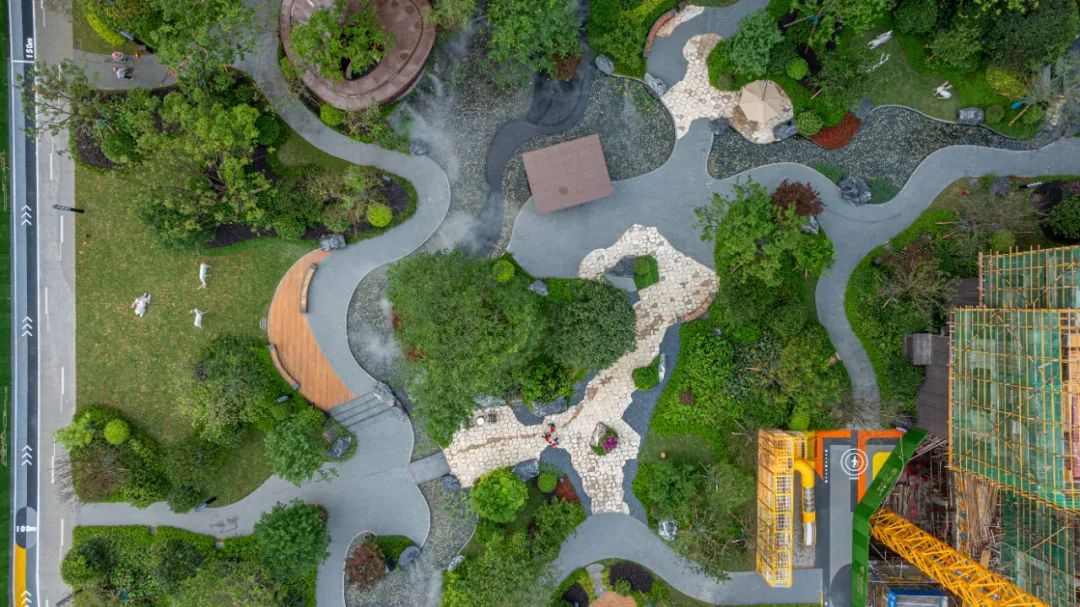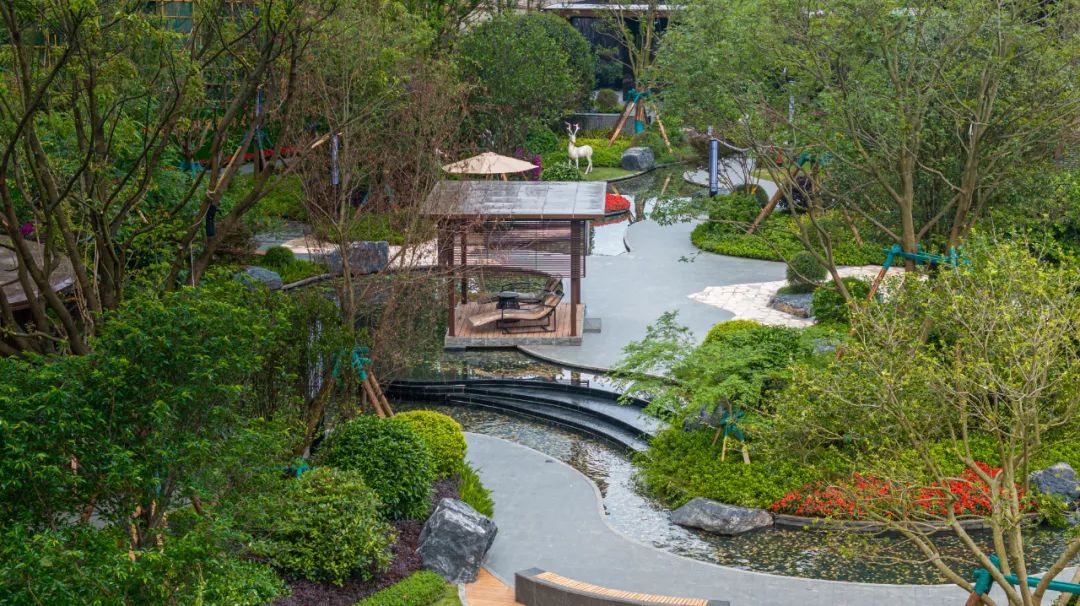 整个园林打破了社区、自然与生活的传统边界,楼栋之间以绿意保持距离,花丛灌木交错迷叠,涉及的香樟、红果冬青、国槐、洋紫荆、红枫、樱花等乔木,随意组合成不同的视觉观感。