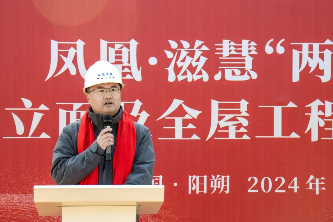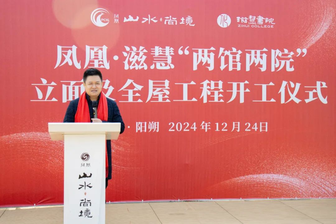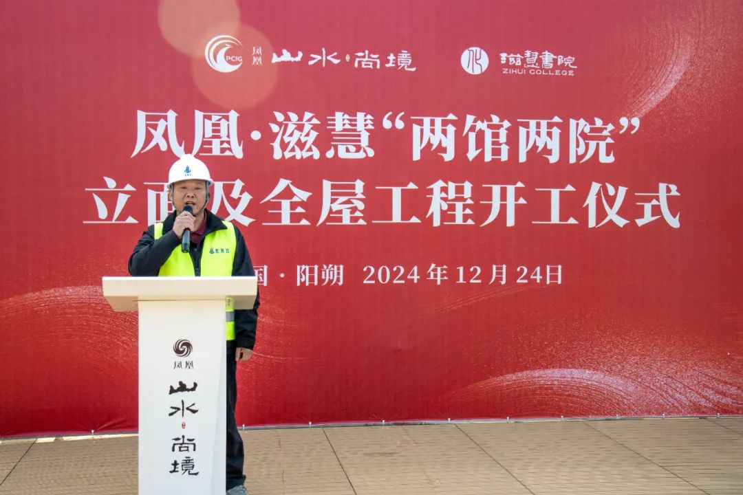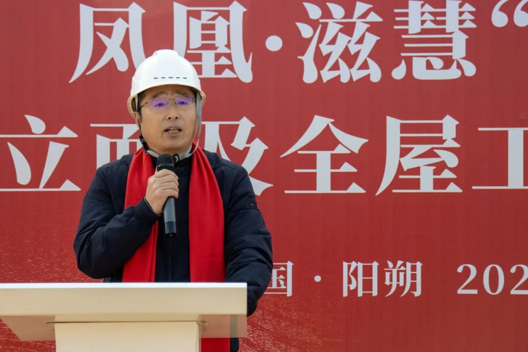 凤凰文投集团副总裁兼桂林地区公司董事长申理峰先生致辞,凤凰-滋慧“两馆两院”项目今天正式启动立面和全屋工程建设, 标志着项目迎来开发建设业态内容的全面升级,将真正开启项目全新康养旅居的新模式。为项目打造国内山水旅居康养首选目的地打下坚实的基础,也为阳朔打造世界级旅游城市高质量发展先导区树立国内顶级康养旅居标杆项目。