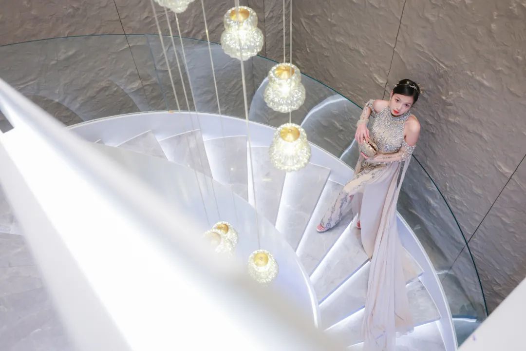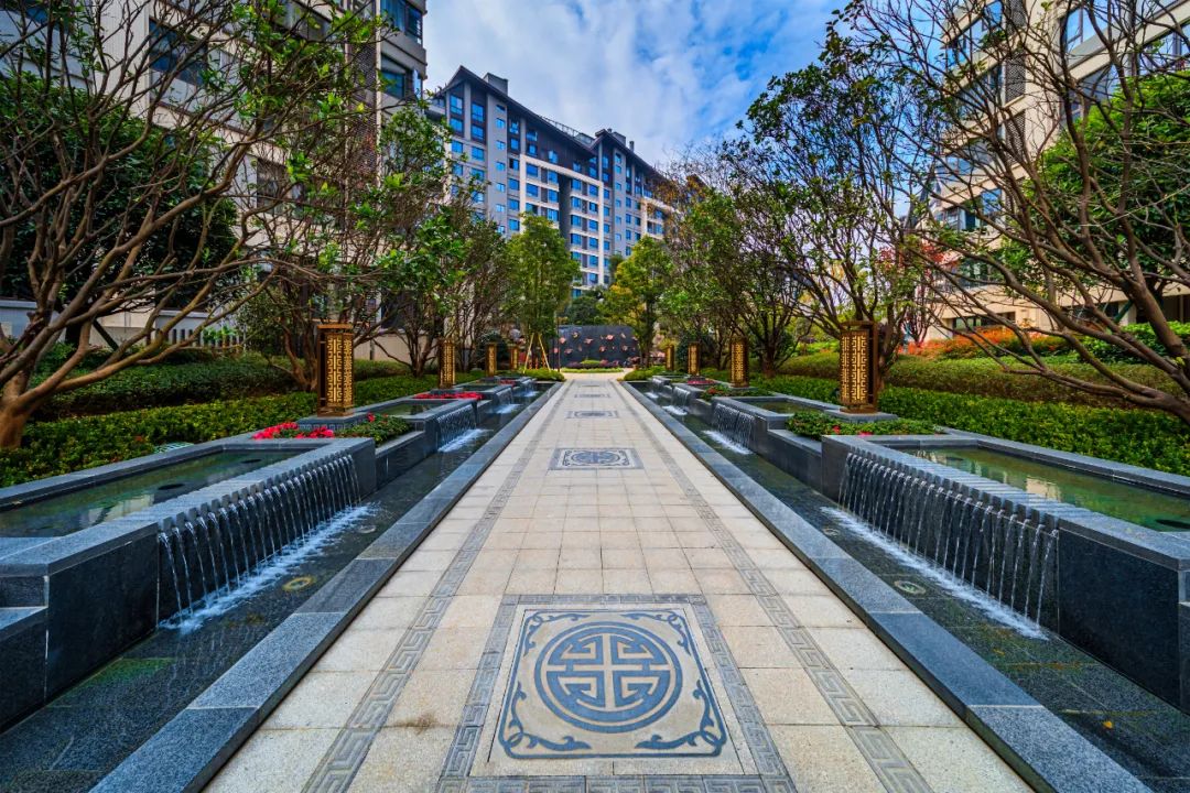 由外而内,穿过水景,进入营销中心之前,还会经过一块巨型祥云地雕,由10多位老师傅,采用古法全手工,花费近一个月打凿而成。在传统文化中,祥云图案象征着吉祥、幸运,寓意着小区的业主们事业高升、财源广进。