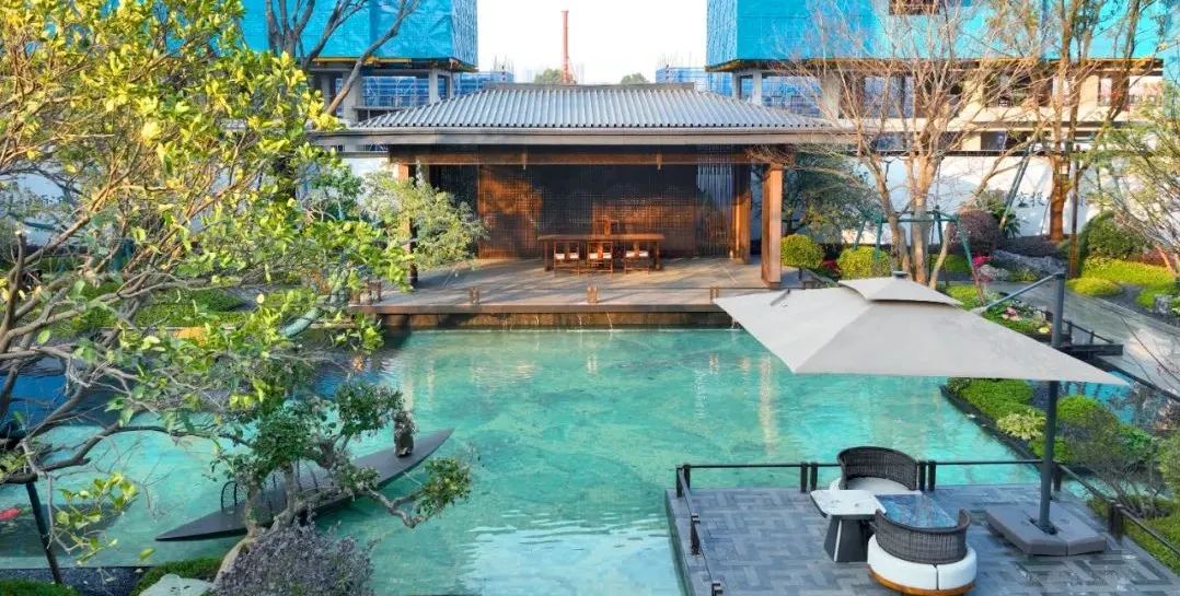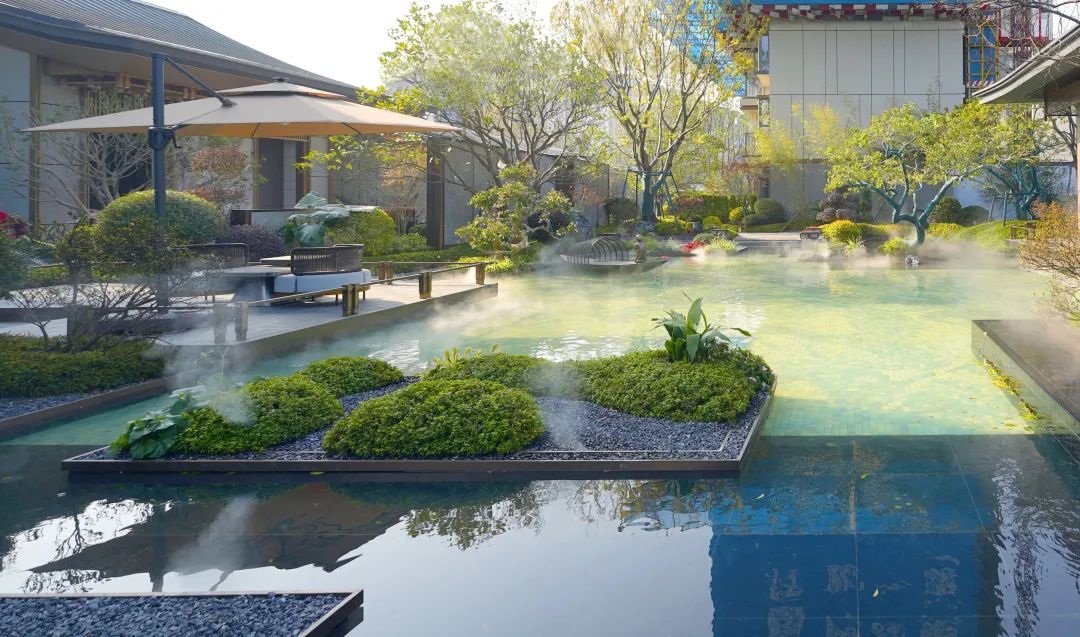深入园区,抬眼郁郁葱葱,低头林荫夹道。精巧的雅奢水院,池底以桂花为元素,取吉祥美好的寓意。水上有坐忘亭立在其间,形成天然的会客场所,在亭间小坐,静观水间一叶扁舟,将生活回归自然,又将自然渲染人烟。以现代东方美学造景理念打造微缩的山水画卷,营造松弛滞在感的度假生活。