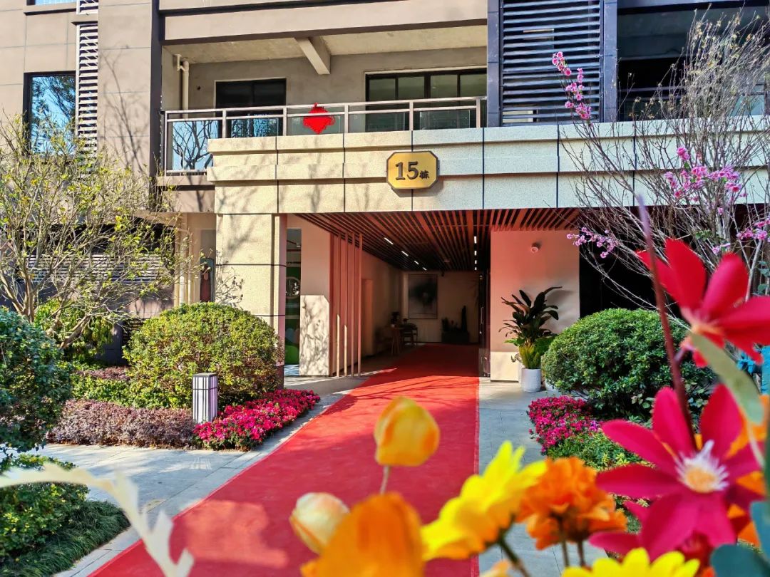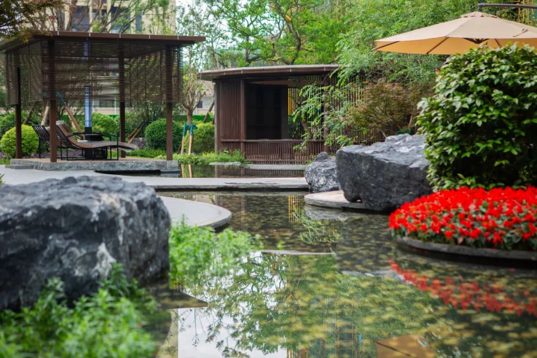 高低错落的乔木、灌木及花草,搭配潺潺水景,多层次的立体植被,让整个景观精致讲究且视野郁郁葱葱。移植的香樟、红果冬青、国槐、洋紫荆、红枫、樱花等高大乔木,则让筑成·唐樾府四季皆有景,季季景不同。