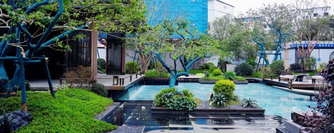 示范区如画卷铺开,微风舞动画笔,泼墨挥毫水墨印染。苍松翠石挺拔傲立,水景波光,映出无限的生机与活力,闲情逸致的生活场景悄然展开,引人入胜。
