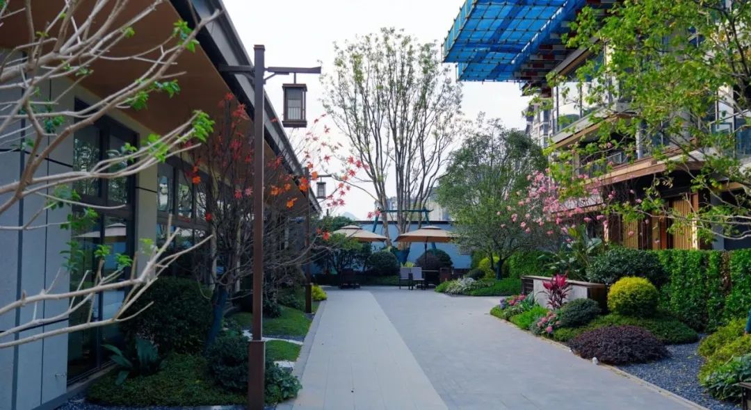 园内林木掩映,小桥流水,古色古香。在这里,居者可以漫步在石板路上,或者在石桌旁品茶论道,静听鸟语虫鸣,感受古雅静谧的氛围。