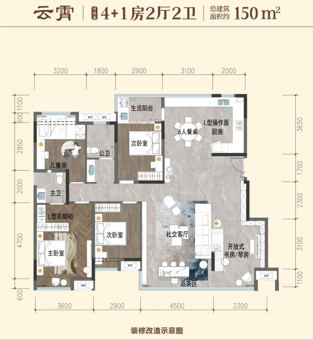 比如这套升级版建面约152㎡的户型,首先,客餐厨空间采用LDK一体化设计,形成一个多元场景的家庭欢聚空间。LDK方厅还预设了一个X空间,可以融合到厅里,也可以独立作为卧室、书房或茶室等使用。