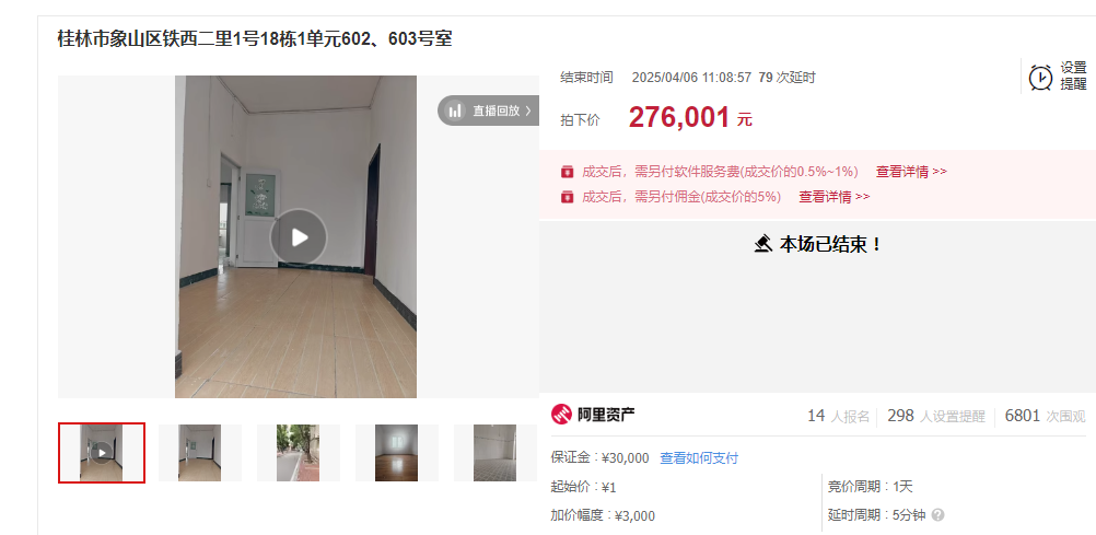 77次延时,93轮竞价,桂林1元起拍法拍房成交!