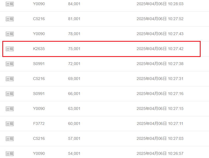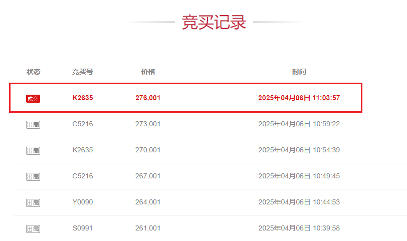 与“Y0090”“C5216”“F3772”“S0991”“G6890”几位高手你来我往、交替竞价半小时后,最终在11:03:57,“K2635”以276001元的“霸气”价格,成功终结了此次拍卖。