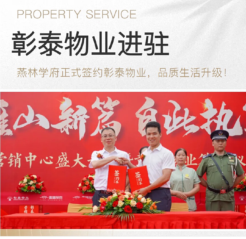 燕林学府与彰泰物业正式签约,强强联合,将以先进的管理理念和24小时管家式服务,为燕林学府未来业主提供贴心、周到、全方位的尊贵服务,让业主尽享舒适与安心。