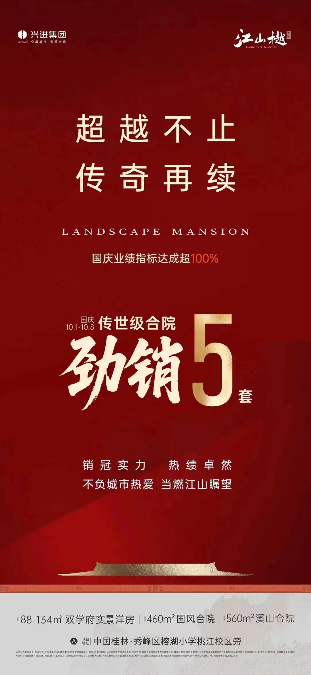 广西兴进集团在国庆期间携旗下九盘联动,以丰富产品线与强劲营销势能礼献市场,旗下多个项目单盘去化超20套,总销售额突破千万元。其中,位于主城区的江山樾、榕湖公馆、漓江郡府、漓江壹号、御园五大项目表现尤为亮眼,业绩全面开花,展现出强大的市场号召力。